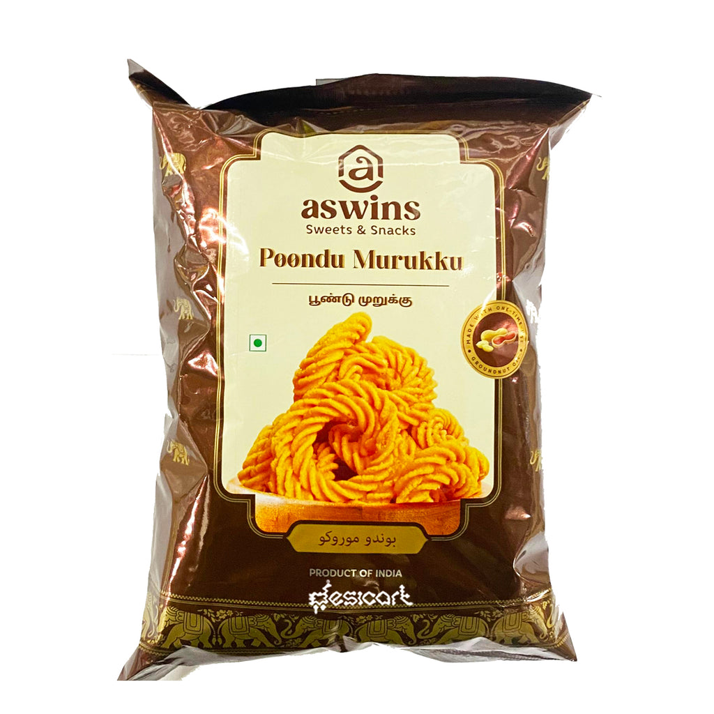 Crunch into tradition with Aswins’ signature Poondu Murukku — a savoury, garlic-infused twist on the classic South Indian snack. Made by Aswins Sweets using a blend of urad dhal flour and butter, this snack delivers a bold garlic flavour and a satisfyingly crisp texture. Ideal for tea-time, travel munching, or festive gifting, it’s crafted fresh in Tamil Nadu for authentic taste and quality
