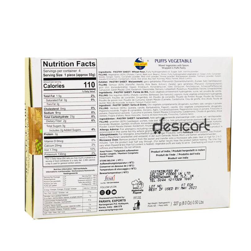 Vegetable Puffs are crisp and flaky, stuffed with Vegetables. It is a quick and tasty snack. As they are baked and not fried, they are healthy as well. Daily Delight Vegetable Puffs are baked, flaky snacks stuffed with vegetables. They are made in modern facilities and are considered fresh and delicious.