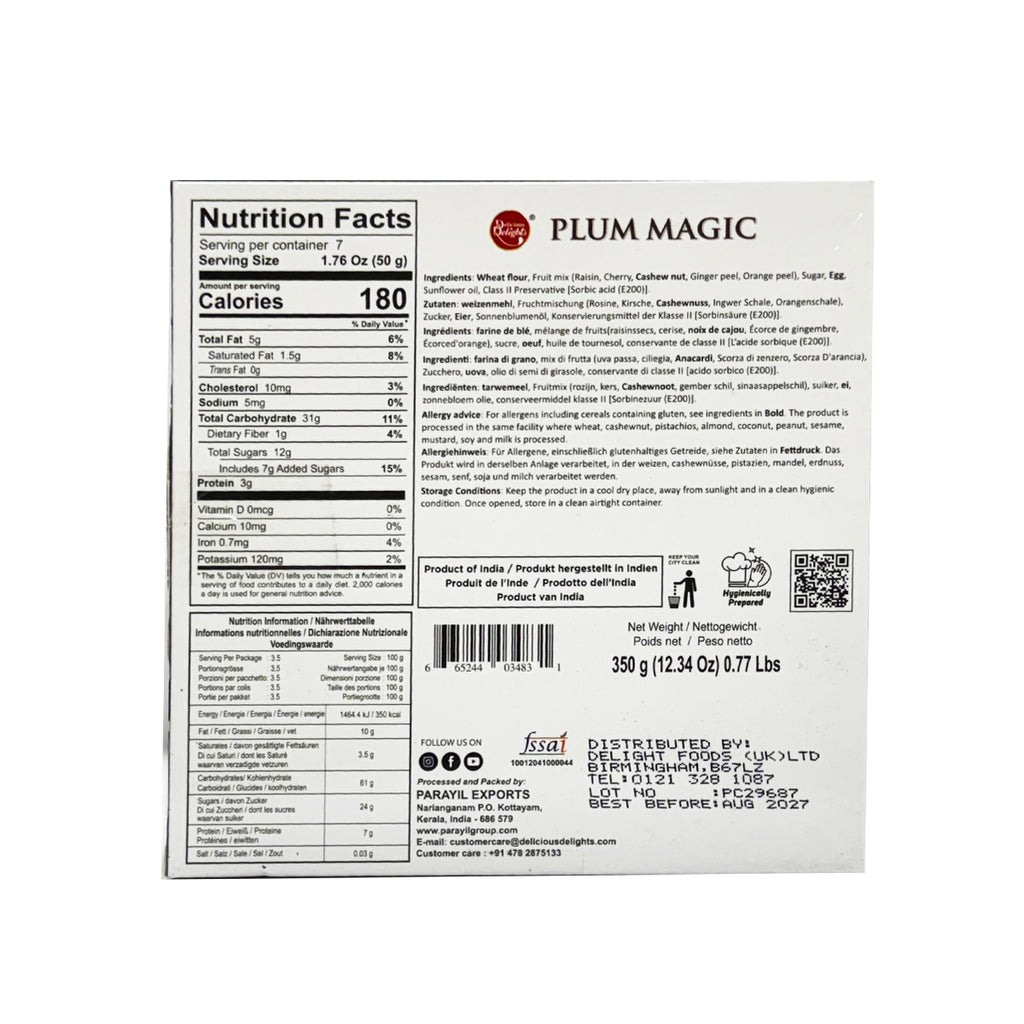 Experience the irresistible charm of Delicious Delights Plum Magic 350g, a premium plum cake crafted with a magical blend of juicy fruits, aromatic spices, and buttery softness. Every bite offers a burst of rich plum flavor with a moist, tender crumb that keeps you coming back for more.