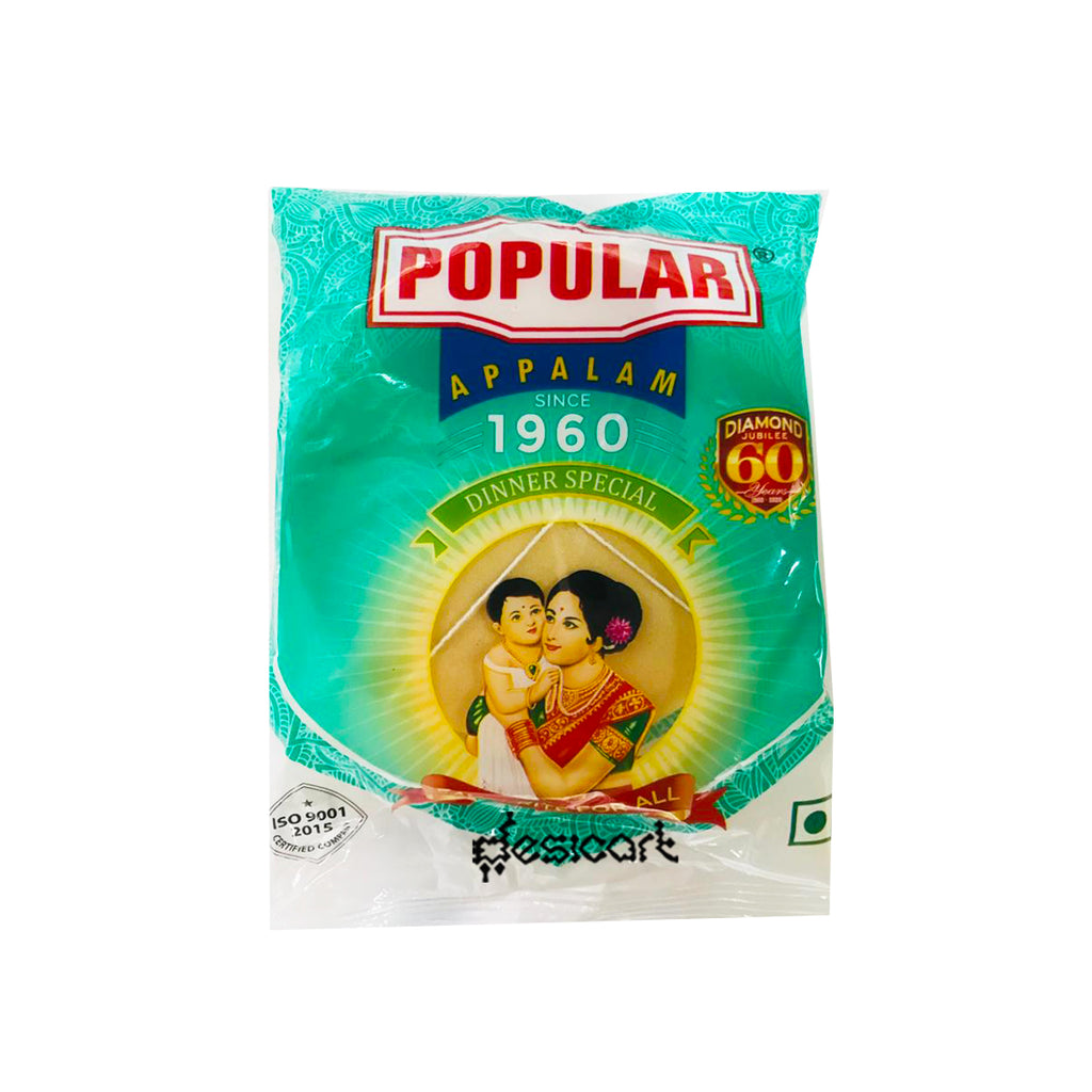 Popular Appalam is a classic South Indian papad made from high-quality urad dal flour, offering a light, crispy texture and authentic taste. These thin, round appalams are a staple accompaniment in traditional meals, adding a satisfying crunch and enhancing the overall dining experience.