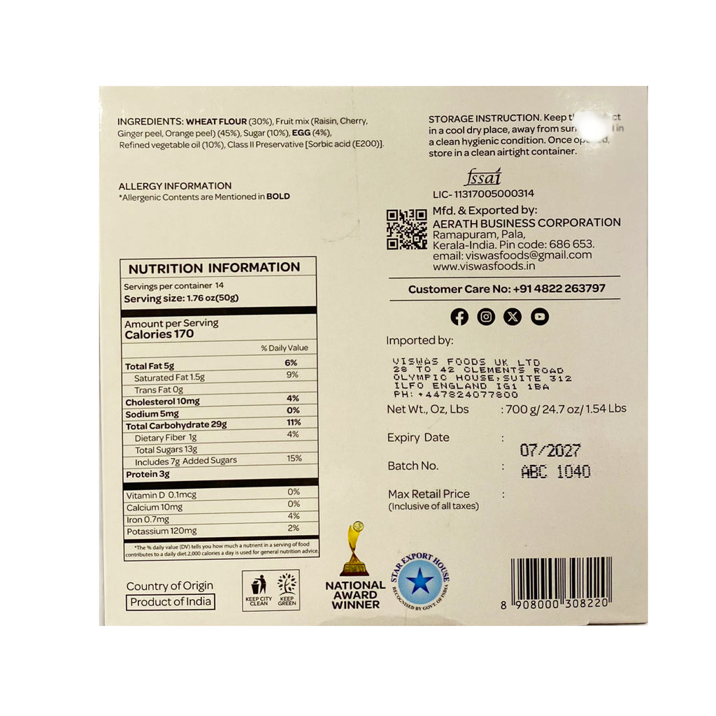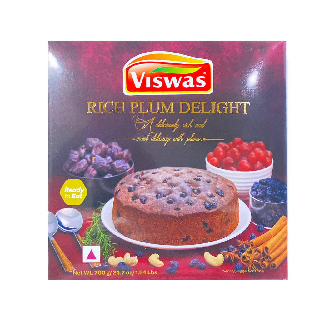 Indulge in the festive richness of Viswas Rich Plum Delight 700 g — a moist, flavour-packed fruit and nut plum cake baked to perfection with premium ingredients. Each bite bursts with the warmth of succulent raisins, cherries, candied peel, and wholesome wheat flour, offering a delightful balance of fruity sweetness and subtle spice. Perfect for celebrations, gifting, tea-time indulgence, or dessert after meals.